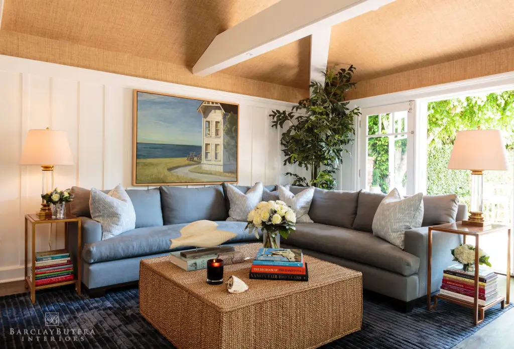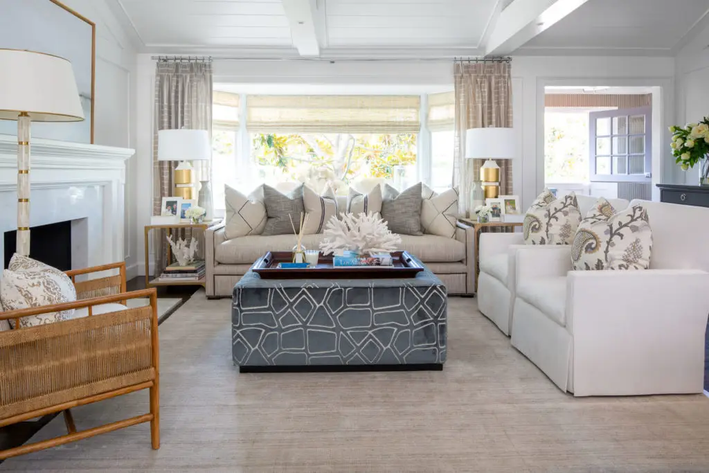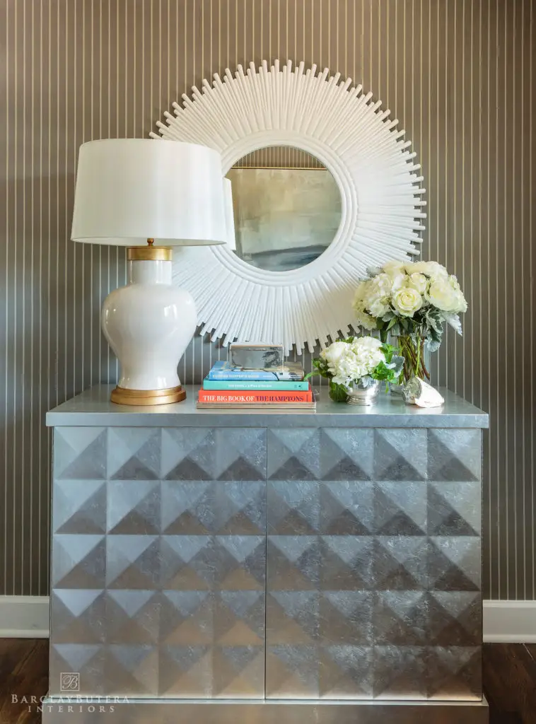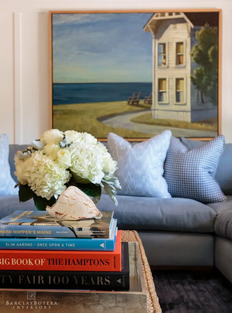 In an effort to embody my new “less is more” philosophy, I knocked down walls to open up the floor plan and replaced the bold blue-and-white color palette with one of soft, muted bluish-grey and neutral tones giving way to a lighter more harmonious atmosphere. In order to cultivate a contrast in the décor, I covered the floors with several thick textured rugs in subdued colors and painted the extensive moldings and wood millwork a crisp bright white. The existing furnishings and upholstery pieces were exchanged for ones that exhibited a balance of both modern and classic lines inviting a sense of comfort and relaxation. Applying a minimalist approach to the accessories, I kept to simple stacks of books and unembellished glass hurricanes however I still made a point to incorporate my signature animal prints throughout the home.